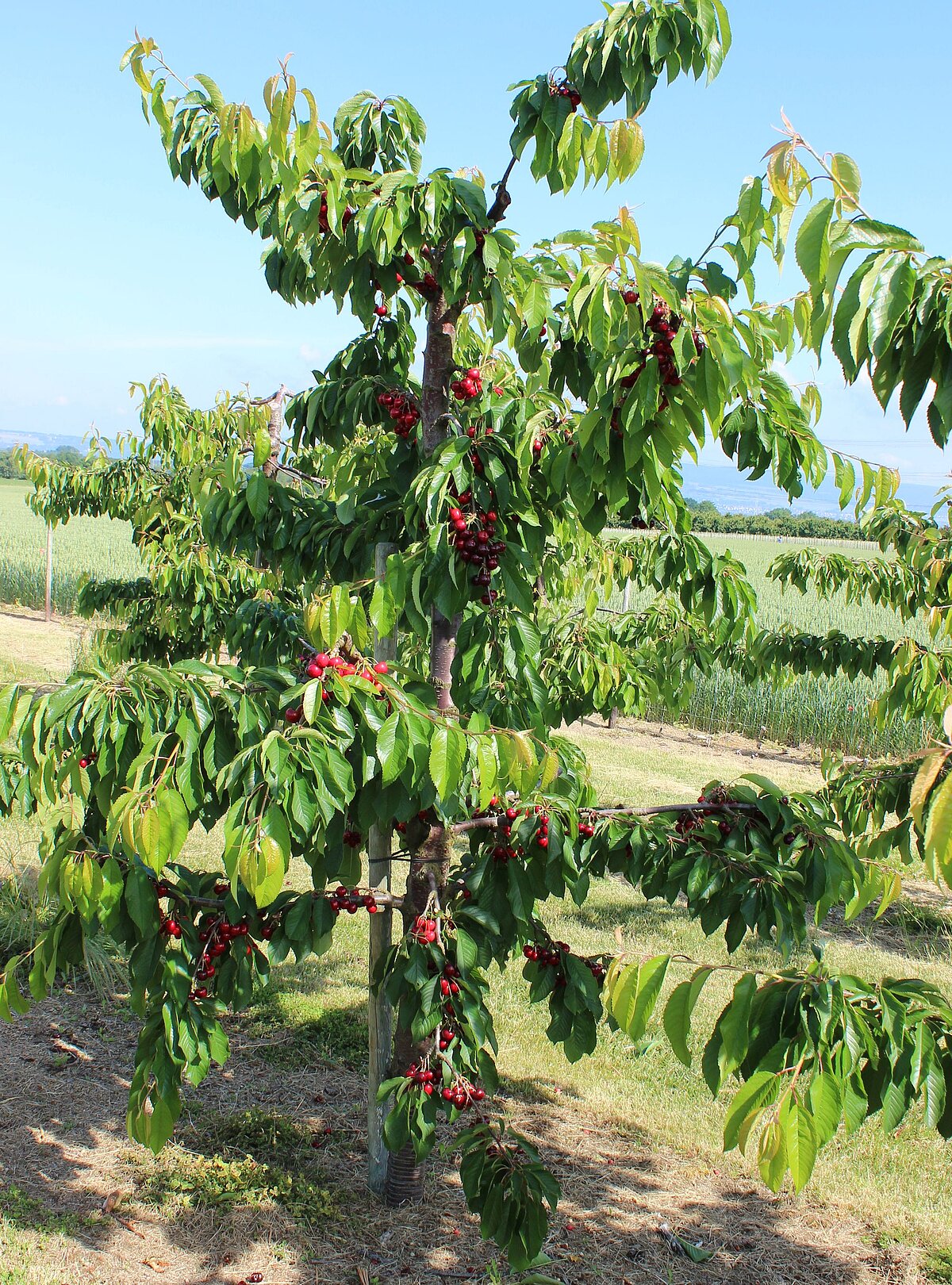Süßkirsche im frühen Reifebereich mit sehr guten Fruchtgrößen bei gleichzeitig hohem Behang. Für die Reifezeit gute Festigkeit und Platzstabilität.